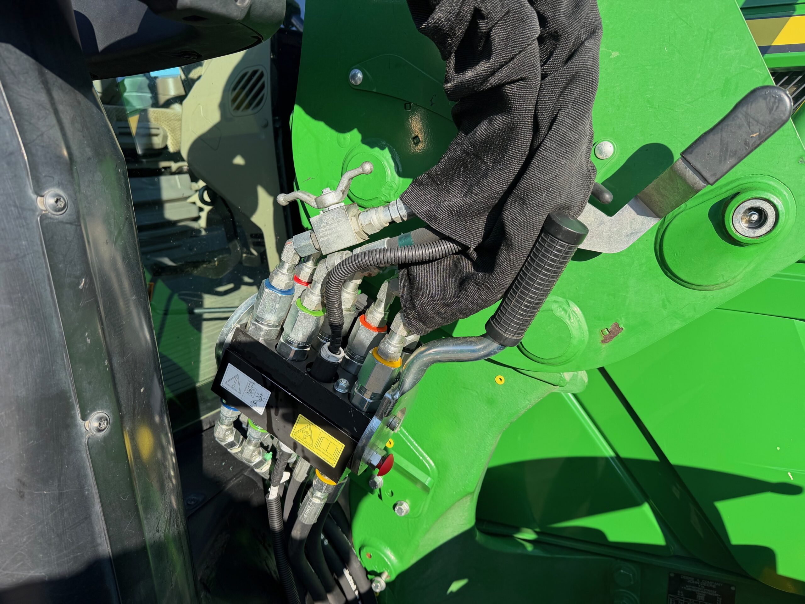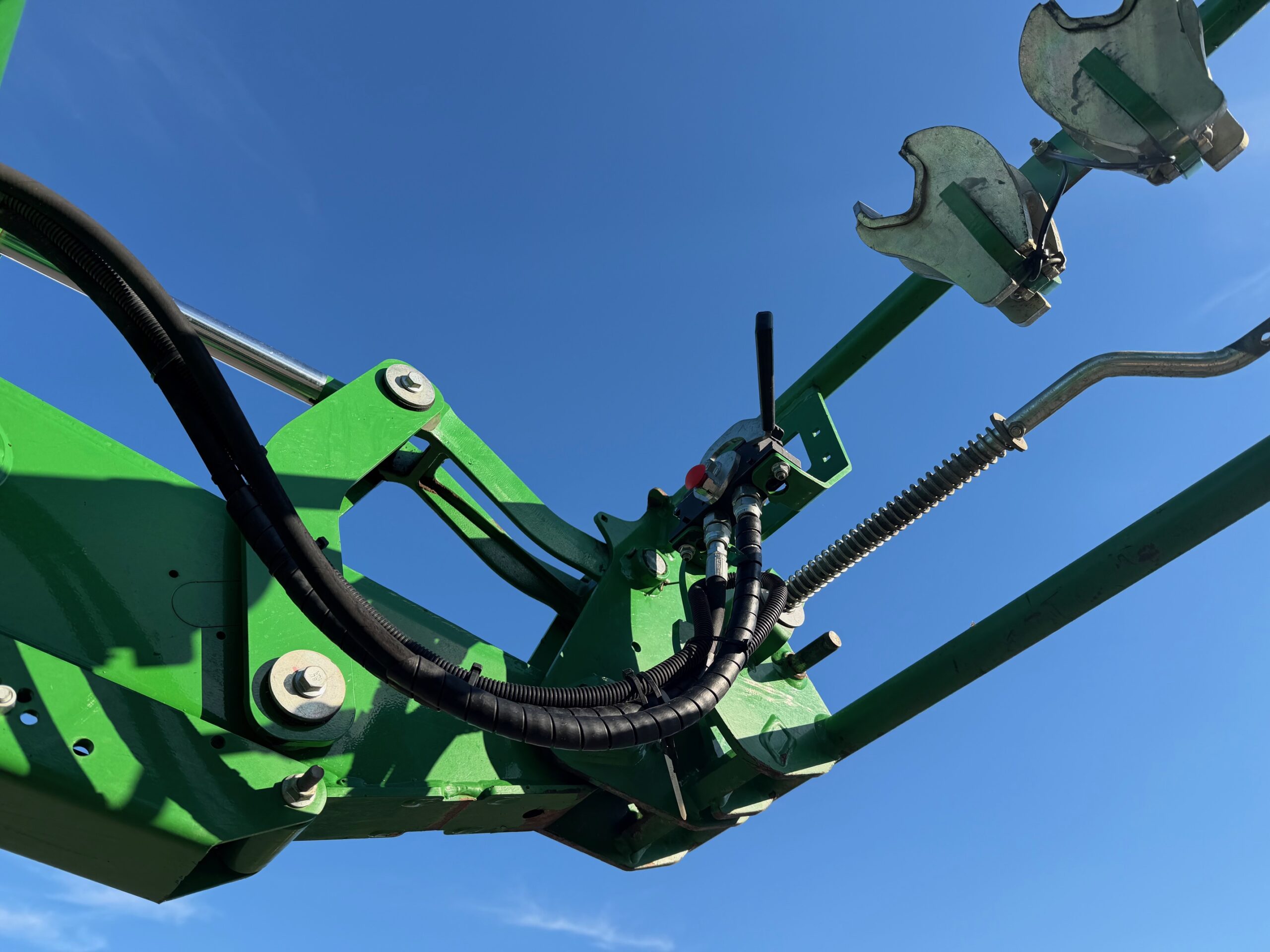 JD 623R voorlader met hydraulische parallel, 3e functie, hydrofix en bediend via midmoundventielen op de originele joystick in de armleuning (met omkeerschakeling).
