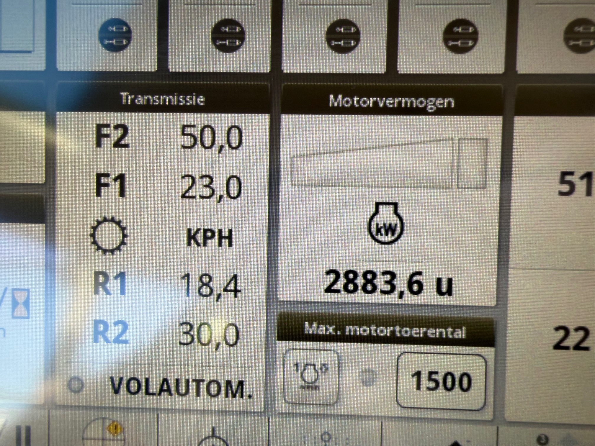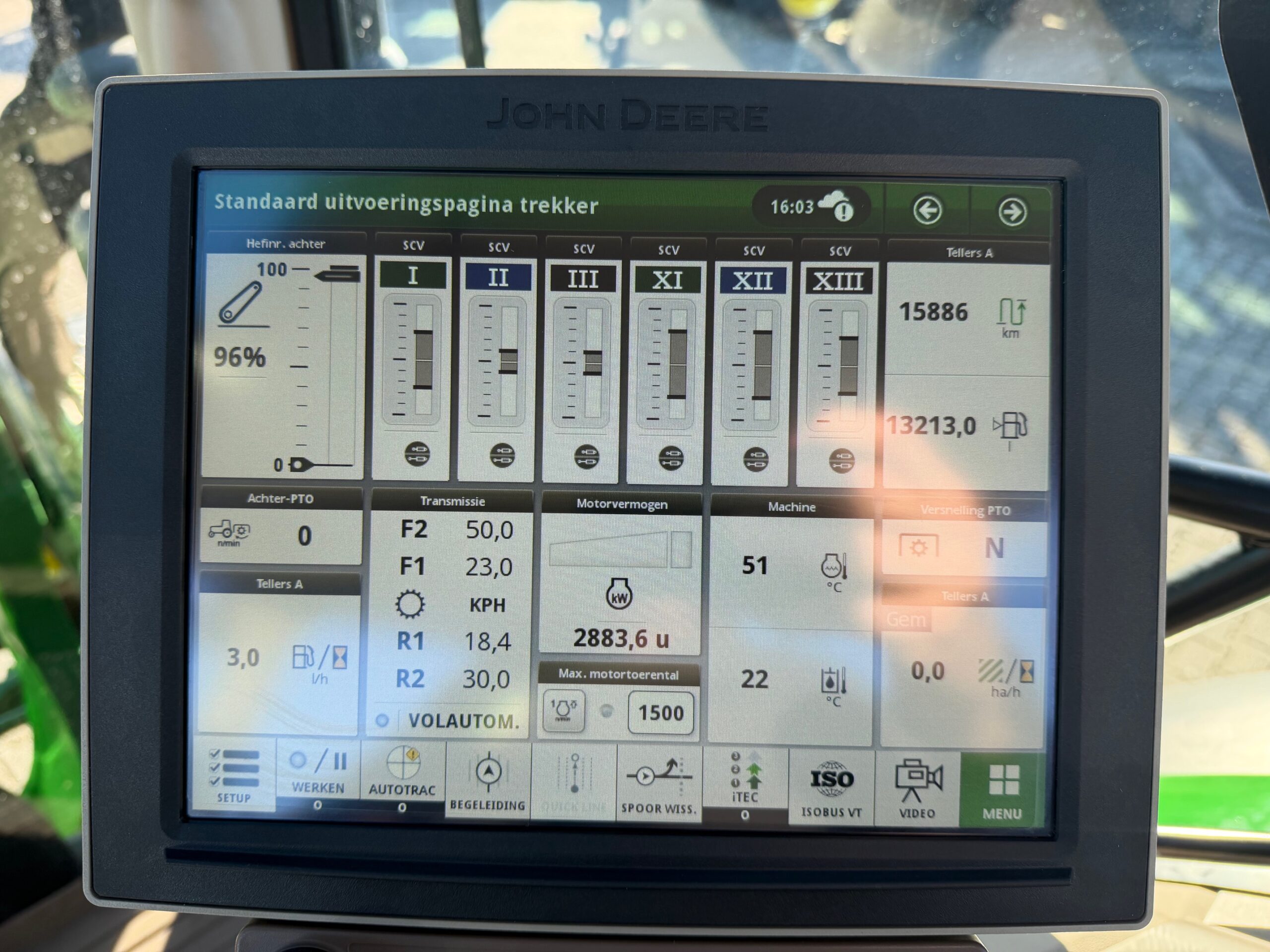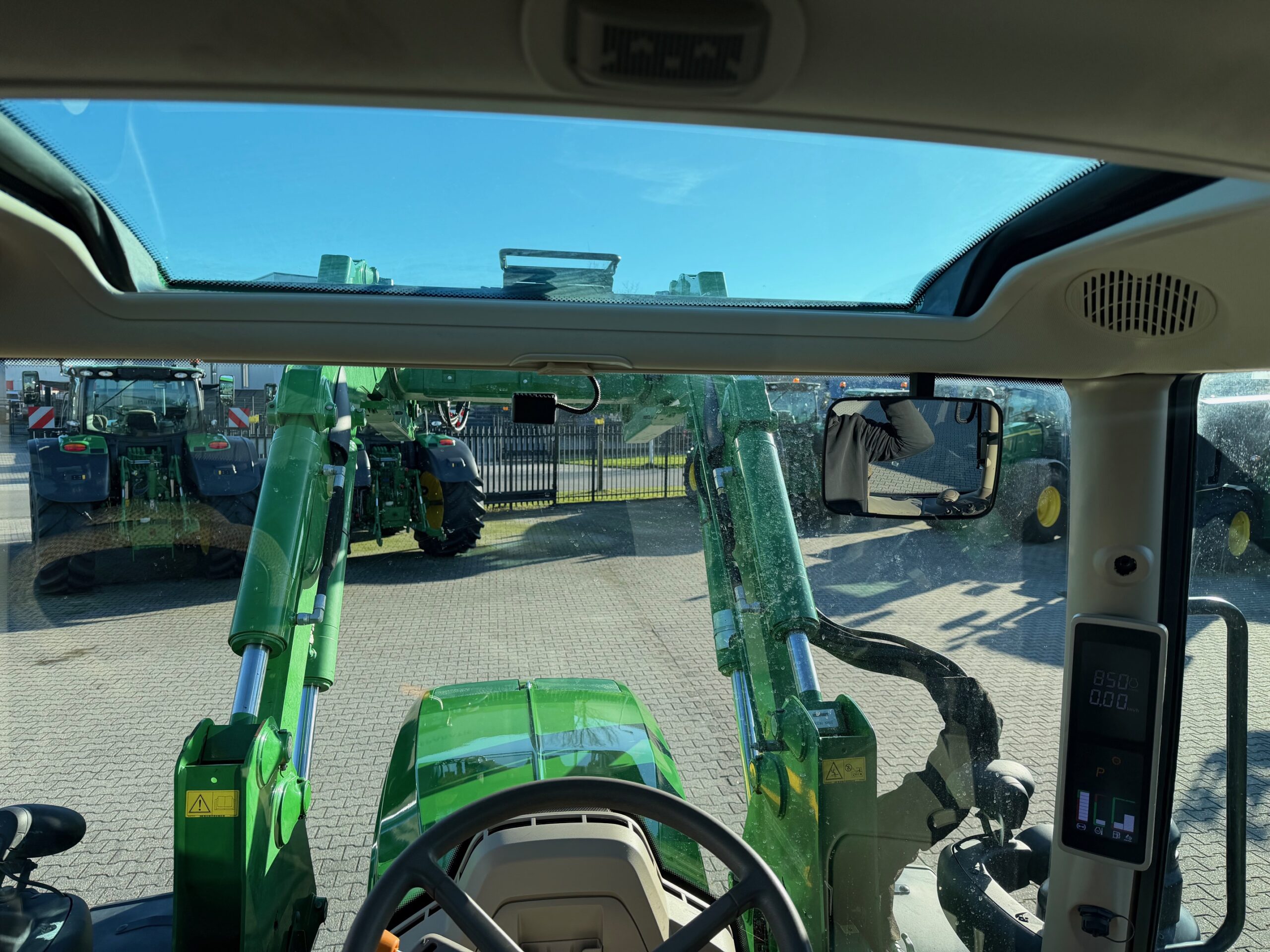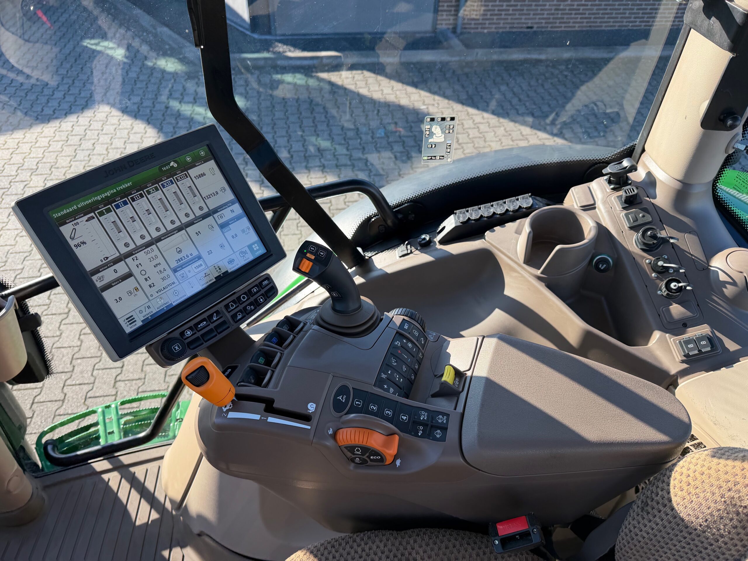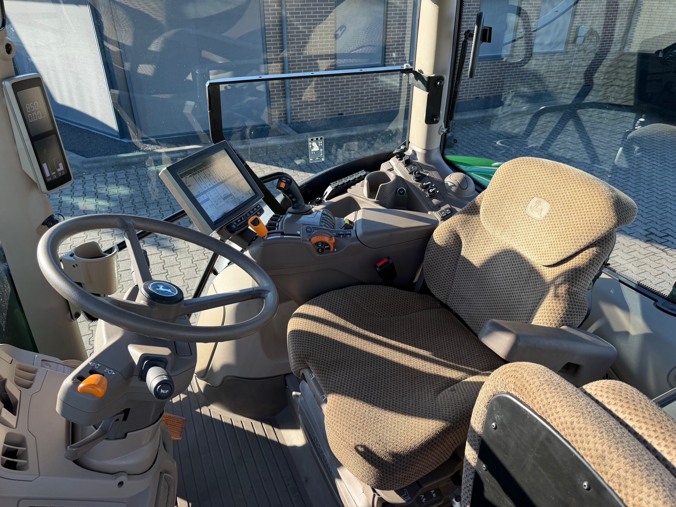 AP 50KM, TLS, geveerde cabine, 3dw en remventiel, luchtdruk, isobus/greenstar ready, B-Stijl (dus met kleine goed sluitende deur), ad-blue, trekhaakrail met kipperknobbel onder, originele JD fronthef met 7-polige stekker, panoramadak voor goed zicht bij voorladerwerk, achterruitenwisser, hef- en pto-bediening op spatbord, airco, zonneschermen voor + achter.