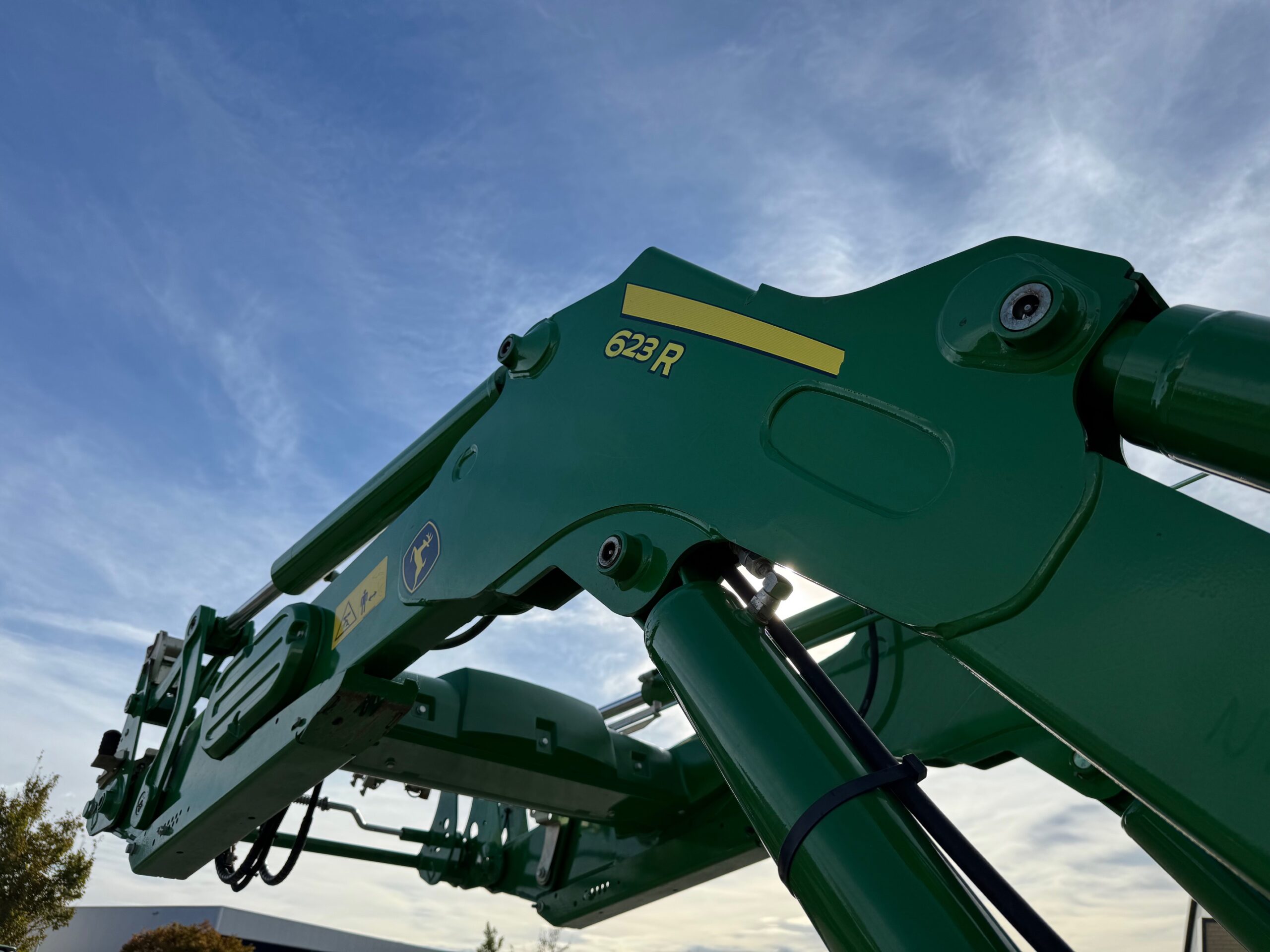 JD 623R voorlader met hydraulische parallel, 3e functie, hydrofix, bediend middels de originele joystick (met omkeerschakeling) in de armleuning via midmoundventielen.