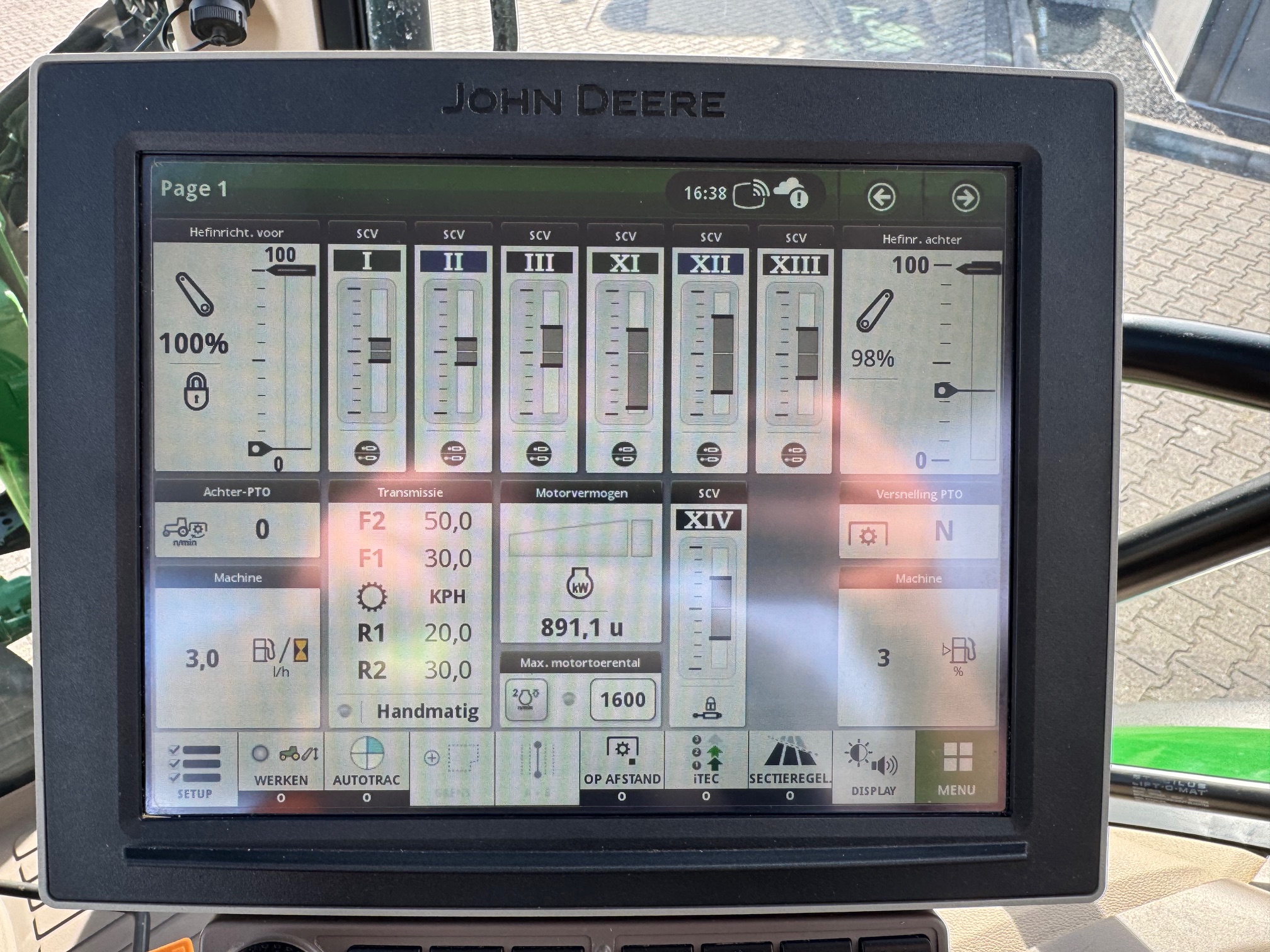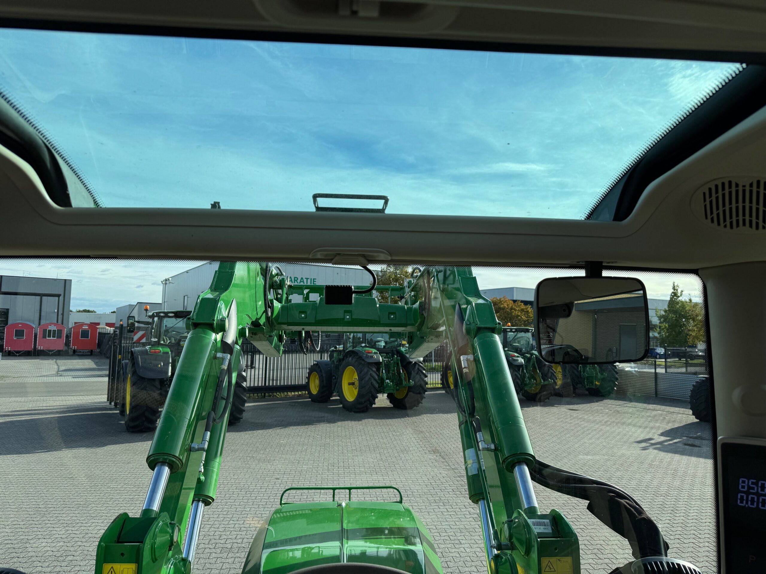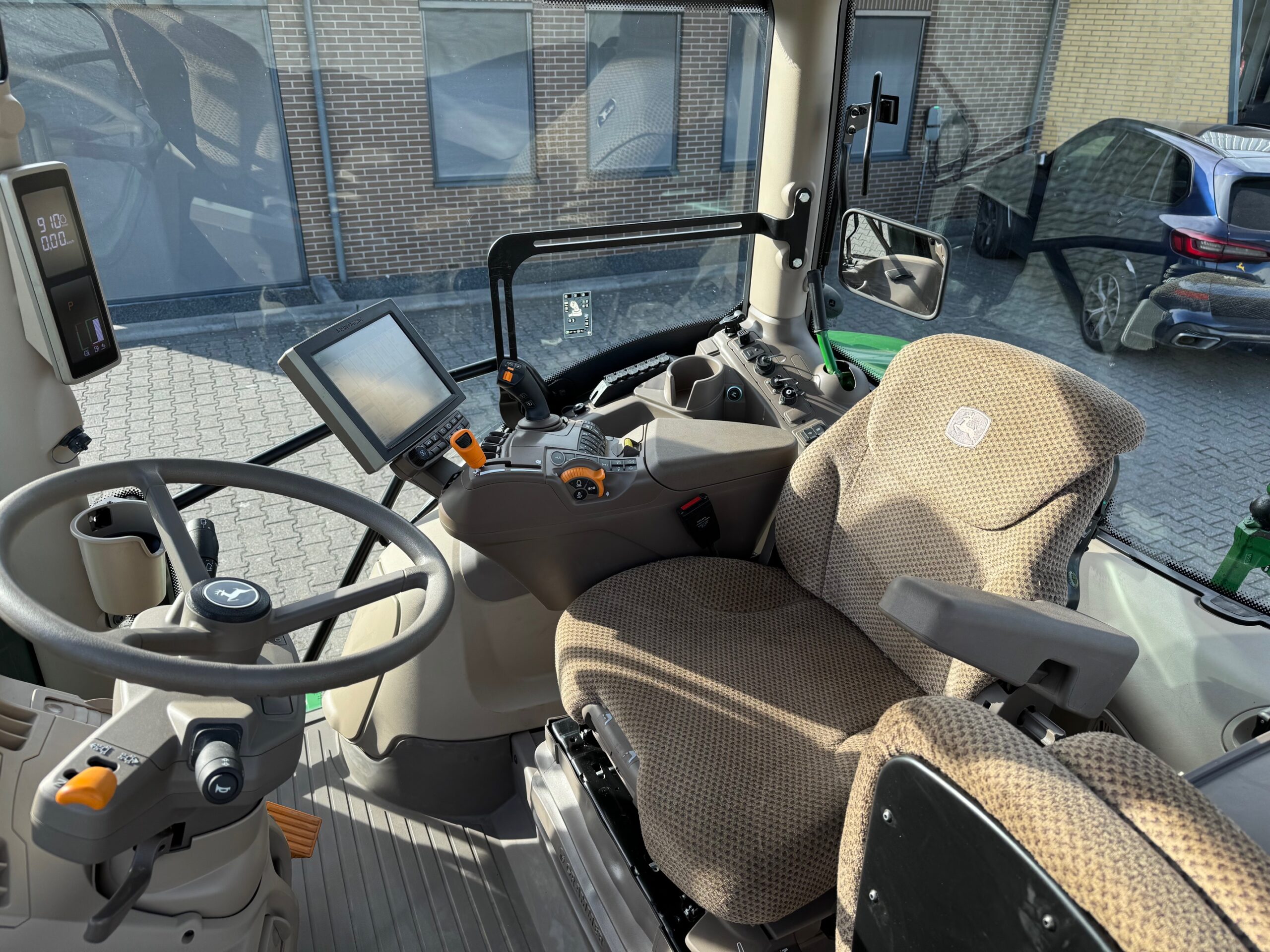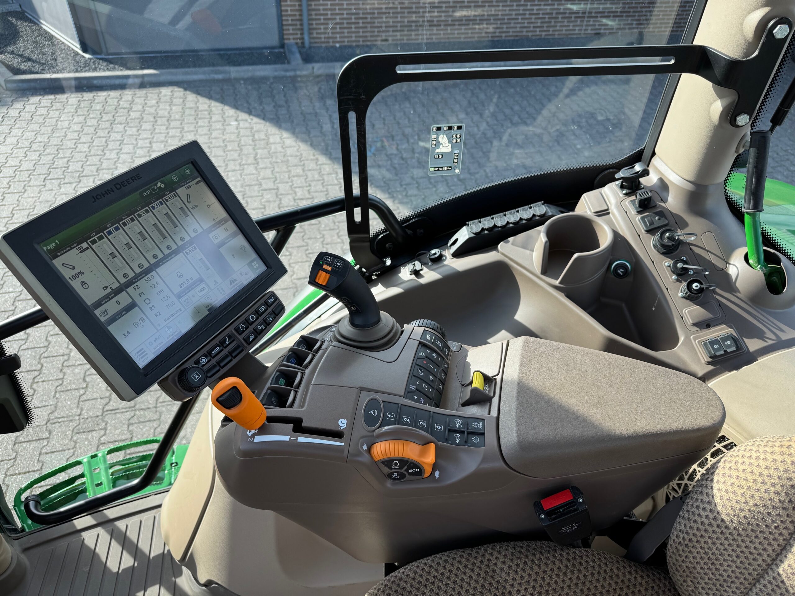 AP 50KM, TLS, HCS, 3dw en 2-leiding remventiel, LS-aansluitingen, AUTOTRAC-READY + activaties, STEEKASSEN, ad-blue, airco, panoramadak, originele JD fronthef met 1dw voorop, frontbediening en 7-polige stekker, B-Stijl cabine (dus met kleine goed sluitende deur), achterruitenwisser, hef-, en pto-bediening op spatbord, stoelverwarming, flessenhouders, zonneschermen voor + achter, koelvak.