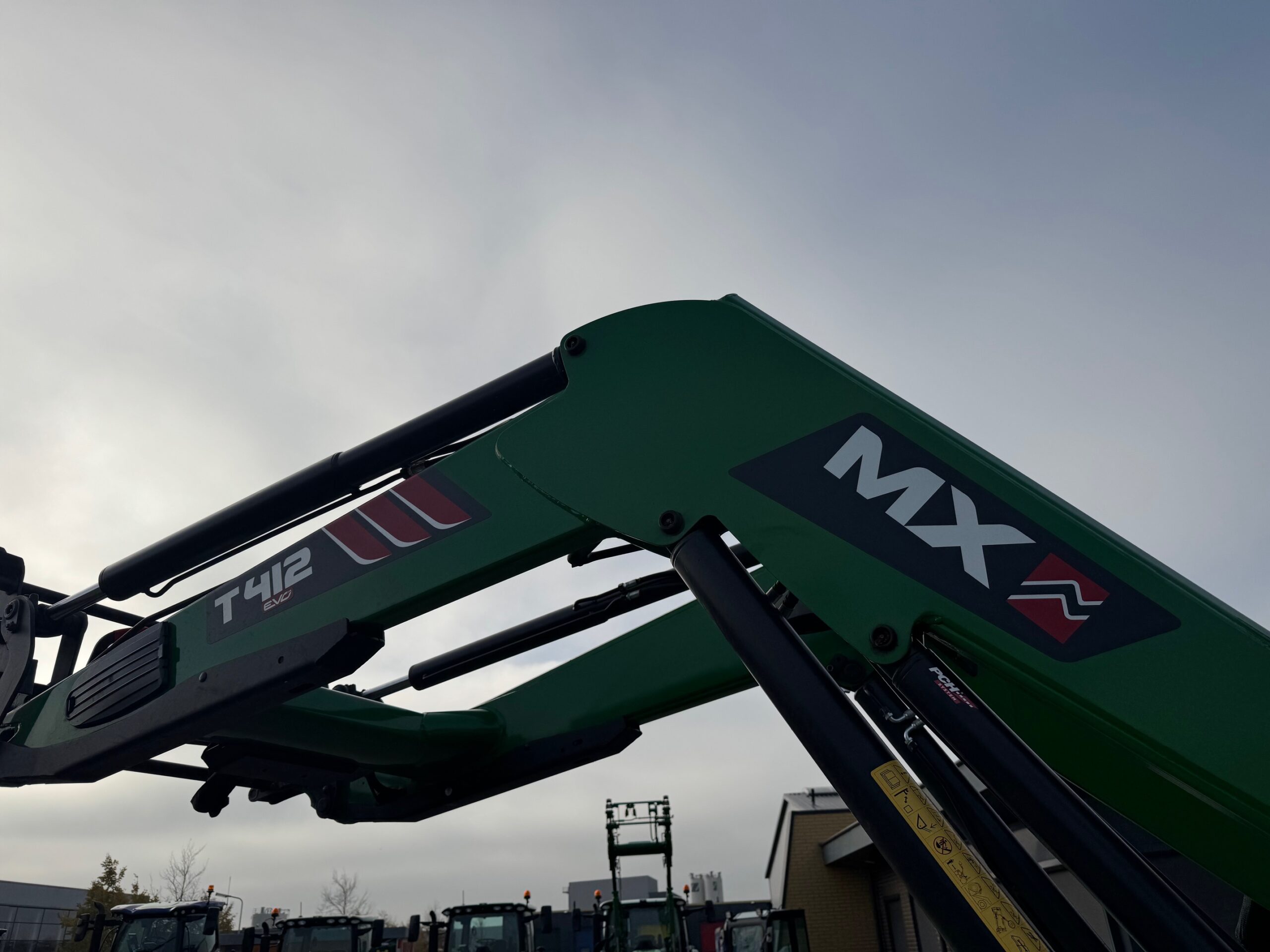 MX T412 EVO voorlader met hydraulische parallel, 3e functie, hydrofix, bediend middels de originele joystick (met omkeerschakeling) in de armleuning via midmoundventielen.
