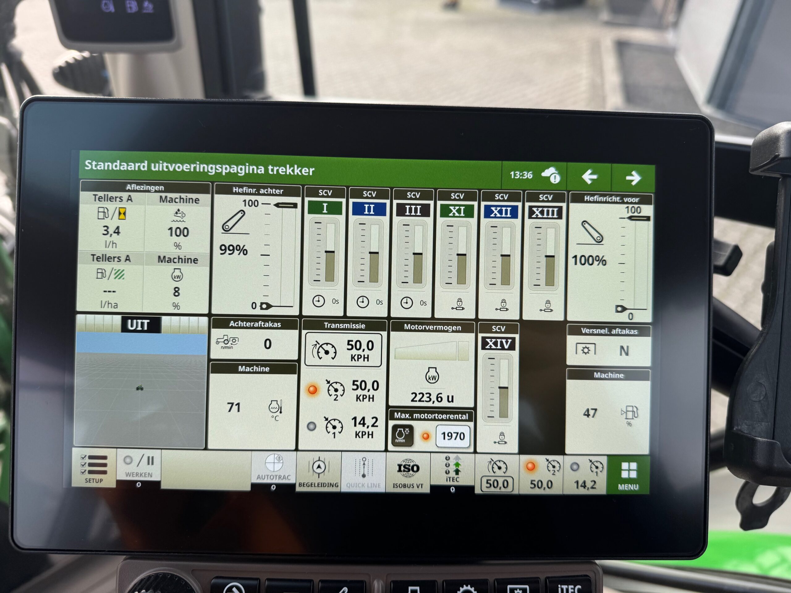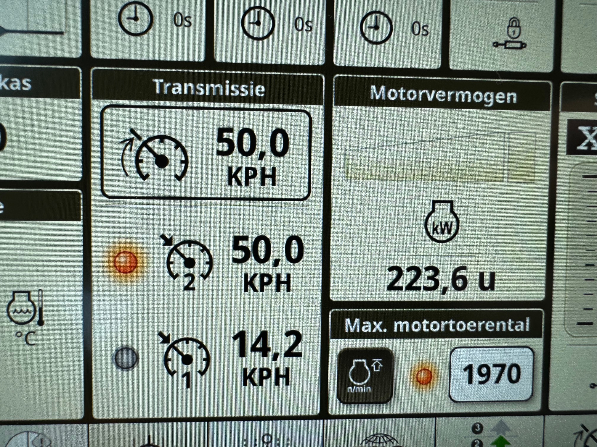 Achterbanden 520/70R38 99%, voorbanden 420/70R28 95%.