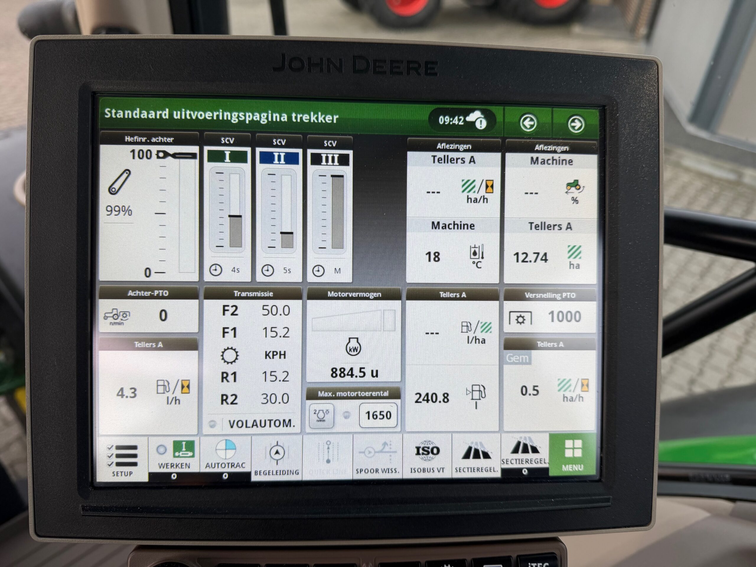 Achterbanden 620/70R42 99%, voorbanden 540/65R30 95%.