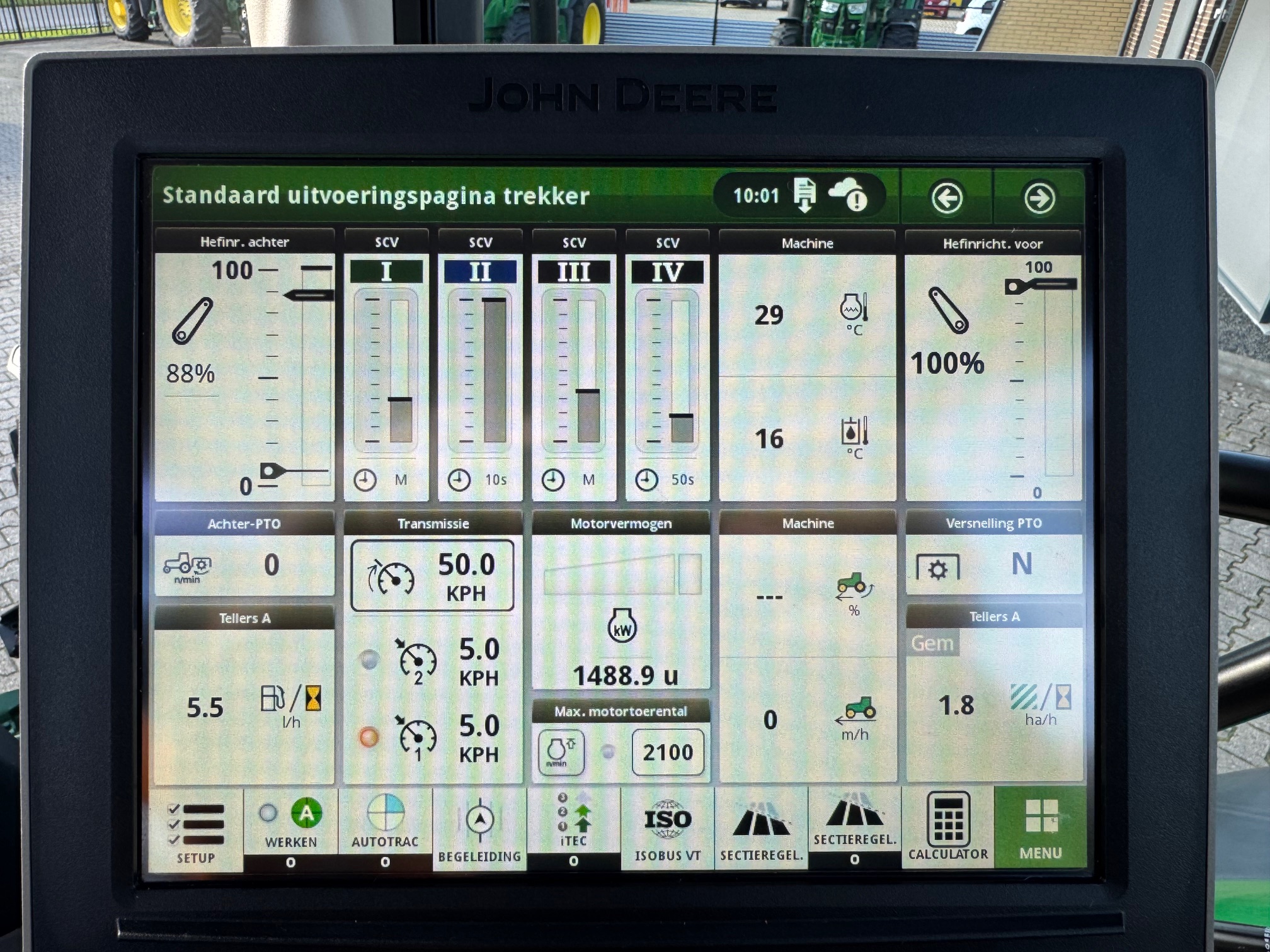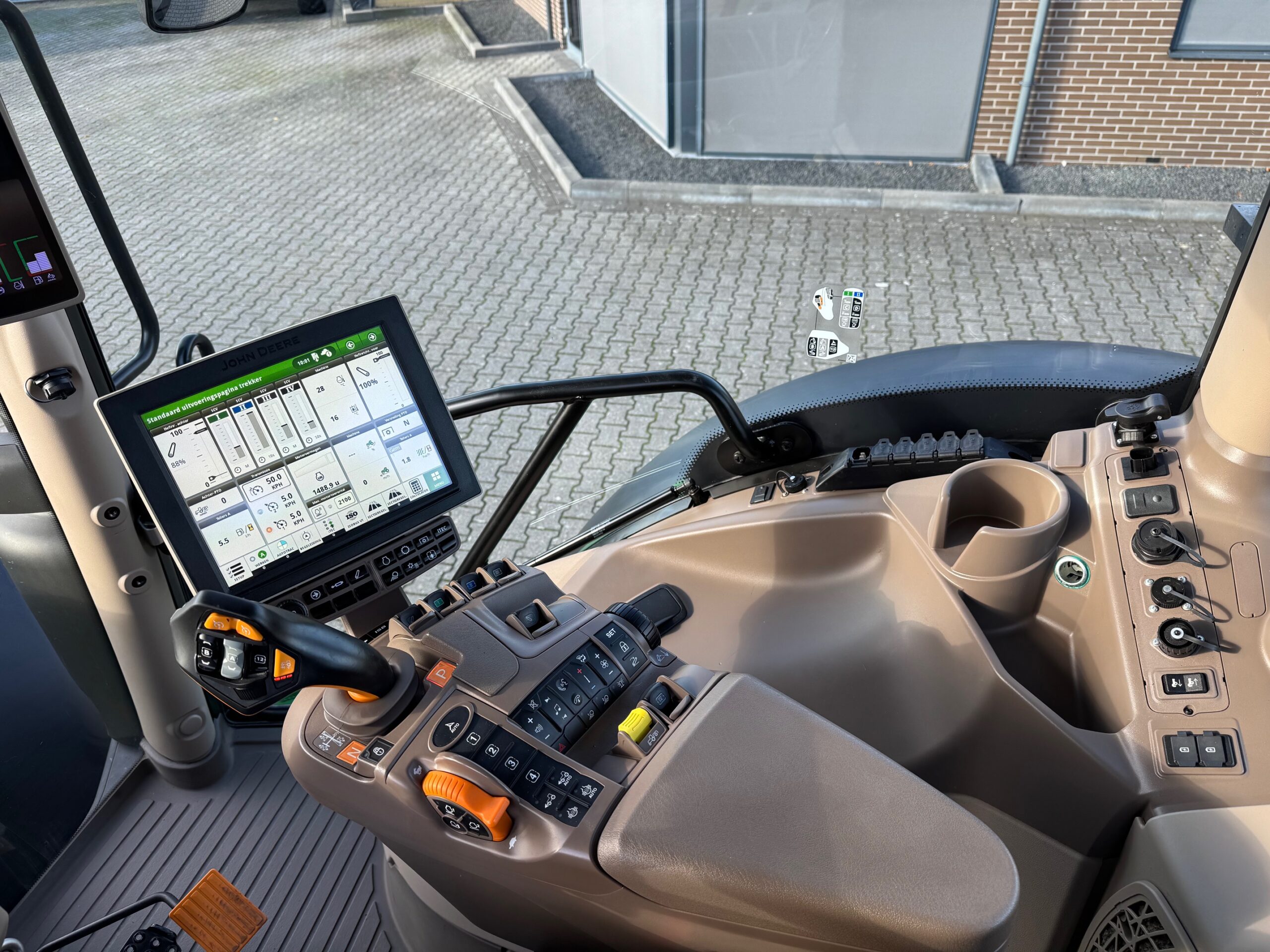 AP 50KM met Command-Pro, TLS, geveerde cabine, 4dw en remventiel, luchtdruk, LS-aansluitingen, AUTOTRAC-READY + activaties, airco, LED, originele JD fronthef met 1dw, frontbediening en 7-polige stekker, Ad-Blue, draaibare voorspatborden, achterruitenwisser, elektrische- en verwarmde spiegels, hef-, pto-en ventiel-bediening op spatbord, stoelverwarming, zonneschermen voor + achter, flessenhouders, grote dieseltank, inklapbare breedteborden, koelvak.