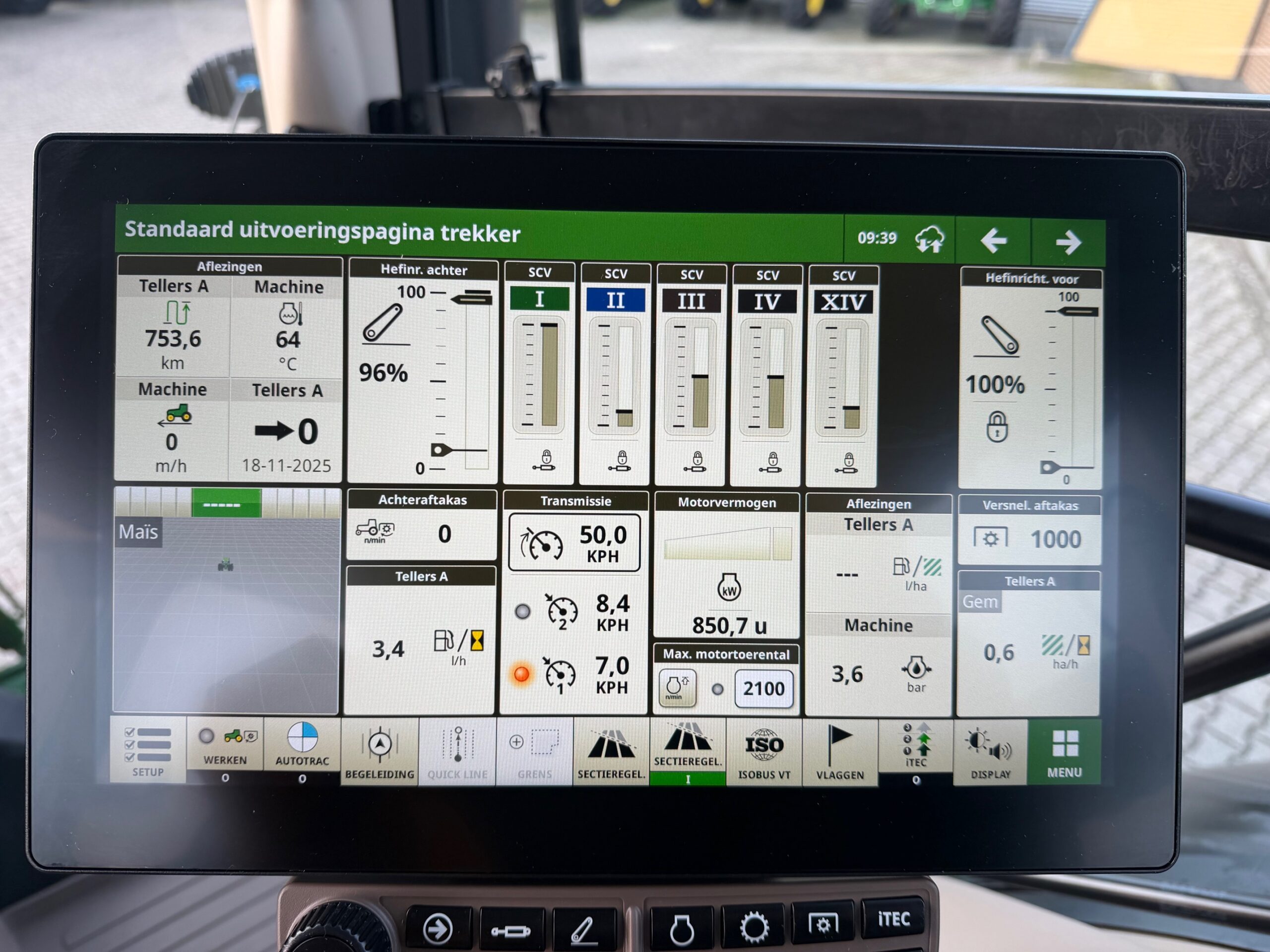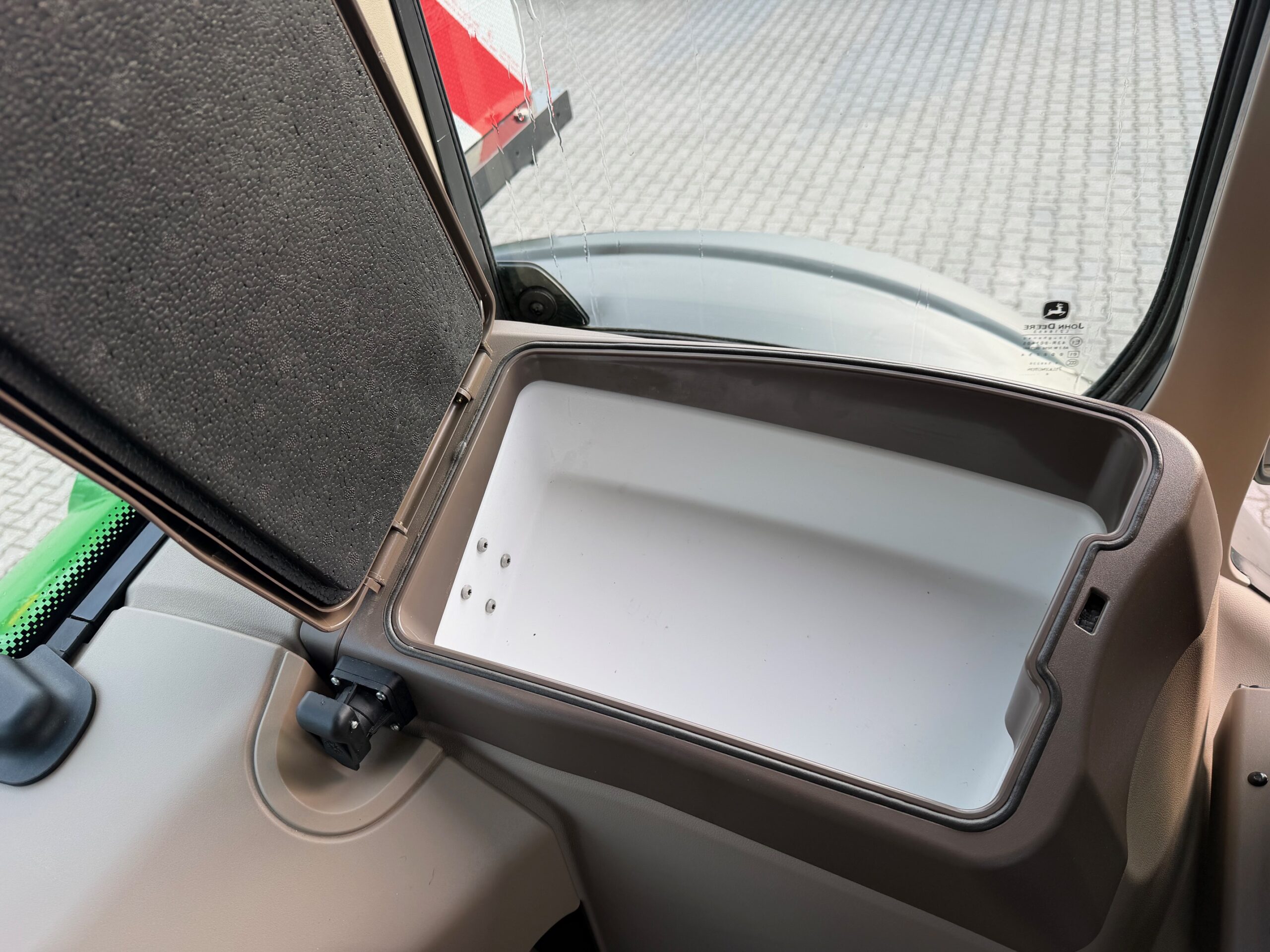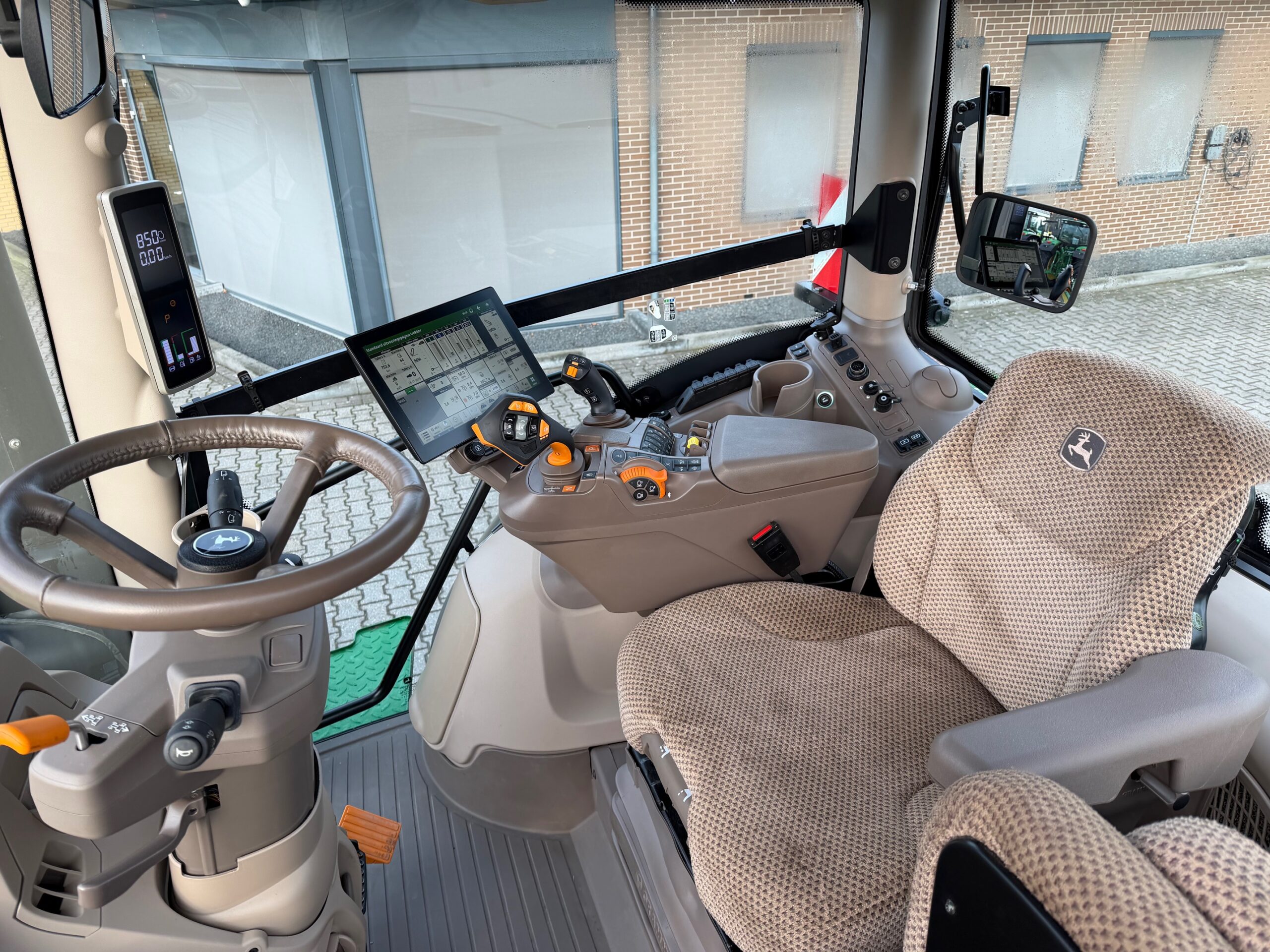 AP 50KM met Command-Pro en G5-Plus display, TLS, geveerde cabine, 4dw en remventiel, luchtdruk, LS-aansluitingen, AUTOTRAC-READY + activaties, airco, originele JD fronthef met 2dw voorop en 7-polige stekker, ook isobus en frontbediening, B-Stijl cabine (dus met de kleine goed sluitende deur), hef-, pto- en ventiel-bediening op spatbord, hydraulische topstang, ABS-stekker, Ad-Blue, grote touchscreen radio, elektrische- en verwarmde spiegels, achterruitenwisser, rail voor bedieningskasten, stoelverwarming, zonneschermen voor + achter, klein sportstuur, flessenhouders, koelvak, draaibare voorspatborden, set wielgewichten, inklapbare breedteborden.
